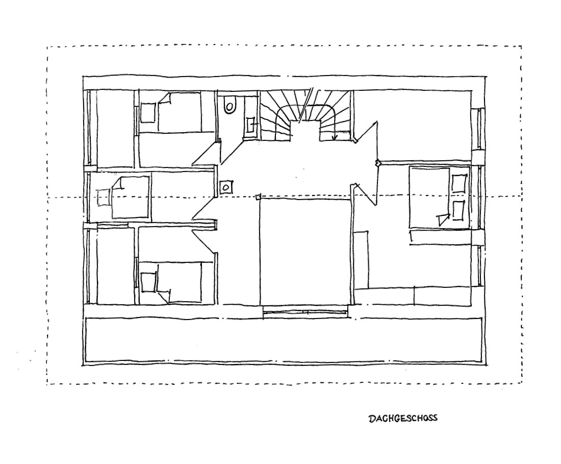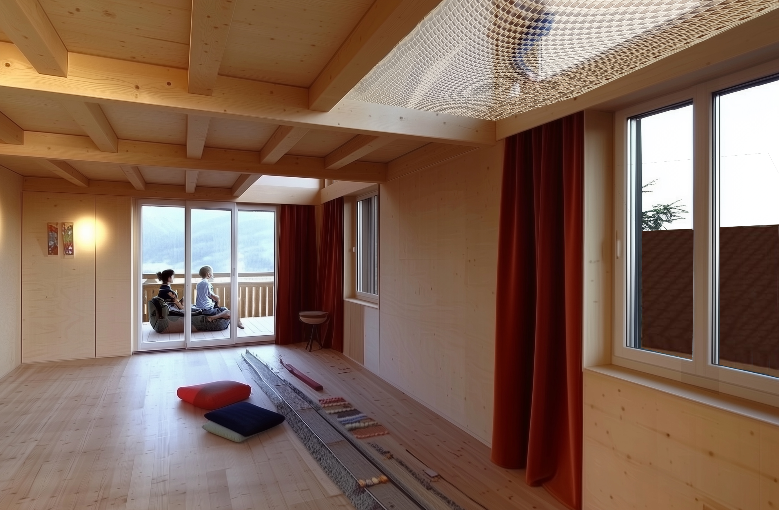 Das Obergeschoss nimmt kommunale Wohnnutzungen auf, darunter ein Mehrzweckraum sowie ein großzügiges Kinderspielzimmer. Auch hier wird das statisch-konstruktive Prinzip der quer und längs gespannten Holzbalken zur Gliederung der Räume genutzt. Über dem Spielzimmer, im ausgebauten Dachgeschoss, befinden sich die privaten Rückzugsräume der Kinder in Form individueller Schlafkojen. Diese sind wie kleine Baumhäuser ausgebildet und stehen in visuellem und räumlichem Bezug zum darunterliegenden Gemeinschaftsraum. Luken und Loftnetze schaffen eine zusätzliche Spielebene, die sowohl funktional als auch atmosphärisch eine kindgerechte Architektur ausformt.