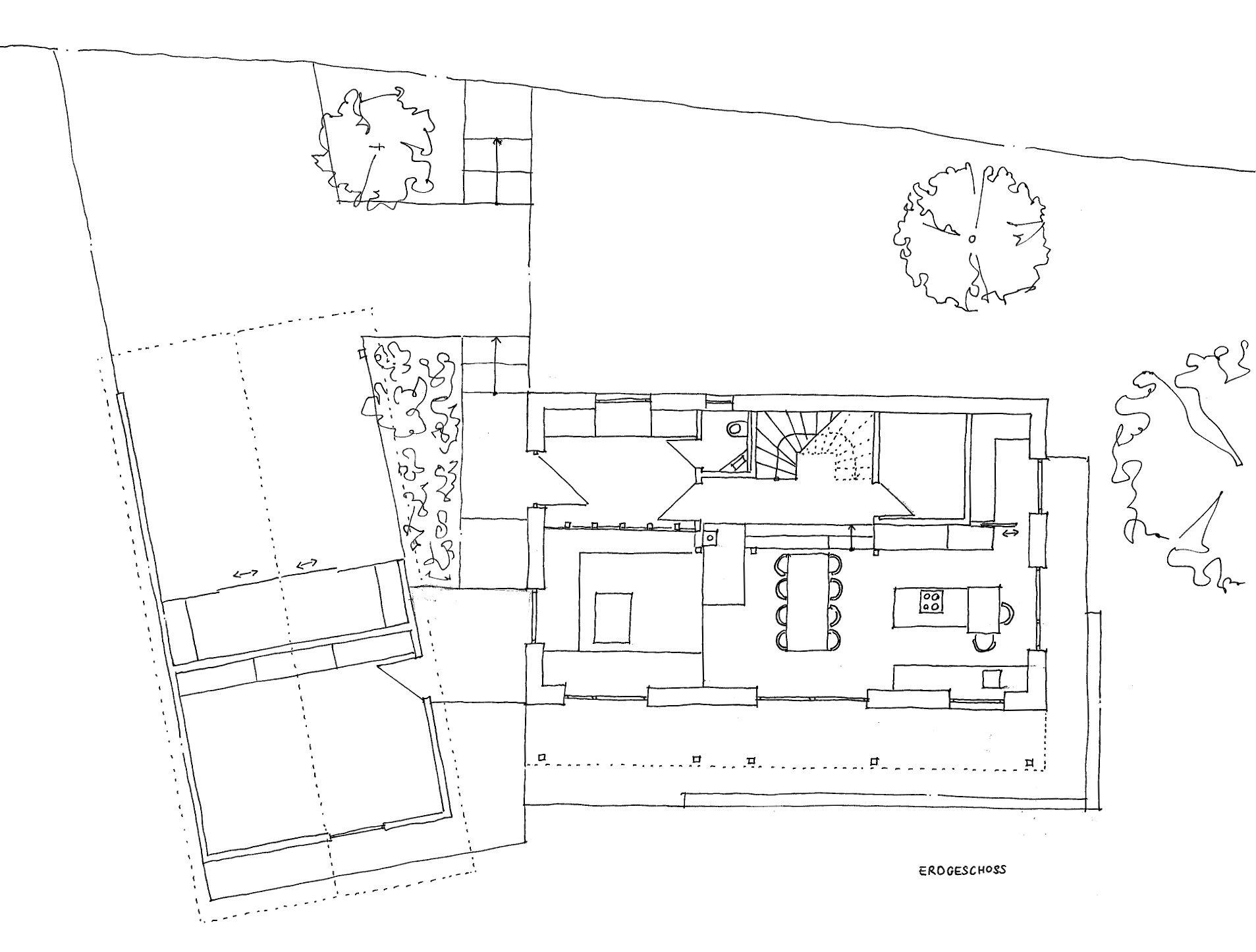 Die neue Setzung des Baukörpers ermöglicht eine spannungsreiche Beziehung zwischen dem Wohnhaus und dem gedreht angeordnetem Nebengebäude. Dazwischen spannt sich ein hofartiger Außenraum auf, der durch zwei seitliche Raumkanten gefasst ist und eine geschützte, halbprivate Zone formuliert. Gleichzeitig wird durch die veränderte Höhenlage der Höhensprung zwischen Straße und Haus reduziert – dies minimiert nicht nur gestalterisch den Sockelanteil, sondern verbessert auch die bautechnische Situation hinsichtlich Hangwasser und Entwässerung.