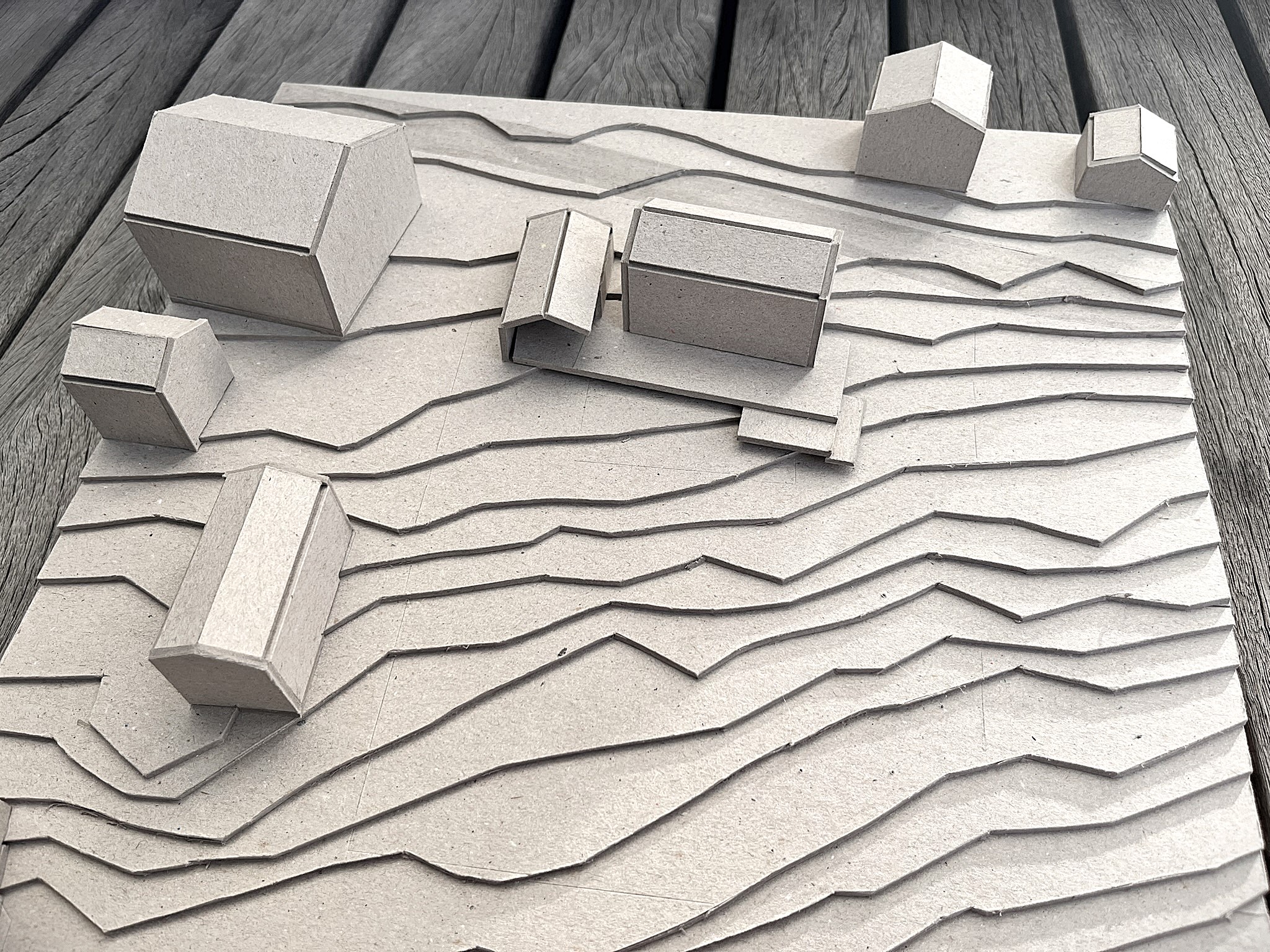 Der Neubau eines Einfamilienhauses in Holzbauweise entsteht in leichter Hanglage am Rand einer gewachsenen Ortsstruktur. Grundlage der Planung war eine Bauvoranfrage, da das Gebäude bewusst von den im Bebauungsplan definierten Baufenstern abweicht. Diese Befreiung wurde im Rahmen einer intensiven städtebaulichen Prüfung genehmigt. Ziel war es, das Haus näher an die Straße zu rücken, um die Raumkante am Ortseingang zu fassen und die städtebauliche Geschlossenheit zu stärken. Gleichzeitig verschiebt sich das Gebäude weiter hangaufwärts nach Norden – dadurch verbessern sich sowohl Aussicht als auch Grundstücksnutzung: Der nordseitige, topografisch schwierig nutzbare Vorgarten wird reduziert, während der nach Süden orientierte Garten deutlich an Qualität und Fläche gewinnt.