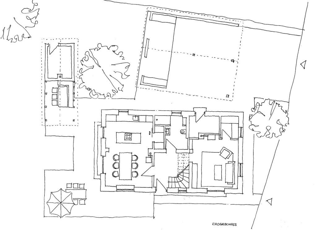 Das architektonische Konzept setzt auf eine behutsame Transformation des Bestands. Im Erdgeschoss werden kleinteilige Raumstrukturen zugunsten großzügiger, offener Bereiche neu geordnet. Aus mehreren ehemaligen Einzelräumen entstand eine offene Wohnküche mit Kücheninsel und großem Esstisch als zentralem Ort des Familienlebens. Der ursprüngliche Eingangsbereich und die historische Treppe bleiben erhalten und verankern das Haus räumlich und atmosphärisch im Bestand. An der Ostseite wird das ehemals durchgängig genutzte Schlafzimmer gemeinsam mit einem Durchgangszimmer zu einem eigenständigen Wohnzimmer zusammengeführt – als ruhiger Rückzugsort abseits der zentralen Wohnzone.